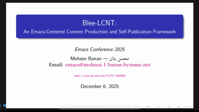 + +Captioner: mohsen + Questions or comments? Please e-mail [emacsconf-org-private@gnu.org](mailto:emacsconf-org-private@gnu.org?subject=Comment%20for%20EmacsConf%202023%20blee-lcnt%3A%20Blee-LCNT%3A%20An%20Emacs-centered%20content%20production%20and%20self-publication%20framework) diff --git a/2025/info/blee-lcnt-before.md b/2025/info/blee-lcnt-before.md index 1fb81a7a..10cb406b 100644 --- a/2025/info/blee-lcnt-before.md +++ b/2025/info/blee-lcnt-before.md @@ -8,12 +8,39 @@ The following image shows where the talk is in the schedule for Sat 2025-12-06. Format: 37-min talk ; Q&A: BigBlueButton conference room Etherpad: Etherpad: Discuss on IRC: [#emacsconf-gen](https://chat.emacsconf.org/?join=emacsconf,emacsconf-gen) -Status: Ready to stream +Status: Now playing on the conference livestream