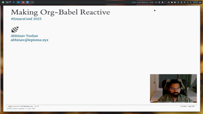 [[!template text="""Hello, everyone. My name is Abhinav,""" start="00:00:01.120" video="mainVideo-org-babel" id="subtitle"]] +[[!template text="""and I'm going to talk about""" start="00:00:03.034" video="mainVideo-org-babel" id="subtitle"]] +[[!template text="""how to make Org Babel reactive. So reactivity here""" start="00:00:03.901" video="mainVideo-org-babel" id="subtitle"]] +[[!template text="""means reactivity in the sense of reactive notebooks.""" start="00:00:07.240" video="mainVideo-org-babel" id="subtitle"]] +[[!template text="""So if you used Org Babel,""" start="00:00:10.001" video="mainVideo-org-babel" id="subtitle"]] +[[!template text="""you might also have used Jupyter notebooks,""" start="00:00:11.601" video="mainVideo-org-babel" id="subtitle"]] +[[!template text="""which are basically notebooks primarily for""" start="00:00:13.934" video="mainVideo-org-babel" id="subtitle"]] +[[!template text="""Python programming,""" start="00:00:16.200" video="mainVideo-org-babel" id="subtitle"]] +[[!template text="""where you have these text and code blocks interleaved,""" start="00:00:16.934" video="mainVideo-org-babel" id="subtitle"]] +[[!template text="""and then you can execute every code block independently,""" start="00:00:20.101" video="mainVideo-org-babel" id="subtitle"]] +[[!template text="""and then you control the order of execution manually,""" start="00:00:23.158" video="mainVideo-org-babel" id="subtitle"]] +[[!template text="""or you can just run the code blocks""" start="00:00:25.859" video="mainVideo-org-babel" id="subtitle"]] +[[!template text="""from top to bottom. But with reactive notebooks,""" start="00:00:27.200" video="mainVideo-org-babel" id="subtitle"]] +[[!template text="""what happens is that there's another way of running""" start="00:00:29.700" video="mainVideo-org-babel" id="subtitle"]] +[[!template text="""which is basically by having all these""" start="00:00:32.928" video="mainVideo-org-babel" id="subtitle"]] +[[!template text="""dependent code blocks automatically get""" start="00:00:35.330" video="mainVideo-org-babel" id="subtitle"]] +[[!template text="""executed whenever you make a change.""" start="00:00:37.000" video="mainVideo-org-babel" id="subtitle"]] +[[!template text="""So for example, if you change a variable,""" start="00:00:38.901" video="mainVideo-org-babel" id="subtitle"]] +[[!template text="""everything else that's dependent on""" start="00:00:40.775" video="mainVideo-org-babel" id="subtitle"]] +[[!template text="""that variable will be executed automatically.""" start="00:00:42.160" video="mainVideo-org-babel" id="subtitle"]] +[[!template text="""I'll show you an example of what that looks like.""" start="00:00:44.434" video="mainVideo-org-babel" id="subtitle"]] + +