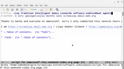 [[!toc ]] Format: 26-min talk ; Q&A: IRC Etherpad: Etherpad: Discuss on IRC: [#emacsconf-dev](https://chat.emacsconf.org/?join=emacsconf,emacsconf-dev) Status: Now playing on the conference livestream
